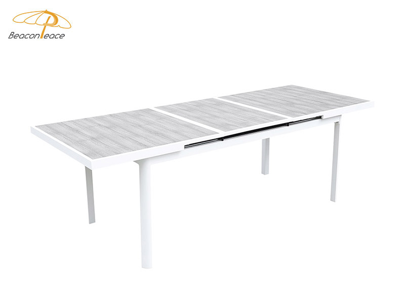 This BP8522 extendable outdoor dining table features a powder-coated aluminum alloy frame paired with a poly-wood tabletop. The aluminum frame is rust-proof, corrosion-resistant, structurally stable, and highly durable, while the poly-wood tabletop authentically replicates the natural texture of wood while offering superior water resistance, weather resistance, and fade resistance. Its smooth extension mechanism allows for flexible adjustment of the tabletop size, effortlessly accommodating both everyday dining and larger gatherings. With its simple, sleek aesthetic, the table complements a variety of outdoor settings—such as courtyards and patios—making it an ideal choice for an outdoor dining table that combines both practicality and sophisticated style.