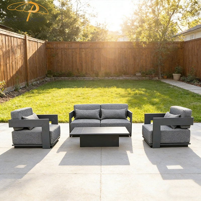 The BP8410 outdoor sofa set features frames and a coffee table crafted from high-quality aluminum alloy. Lightweight yet remarkably sturdy, this material is oxidation- and corrosion-resistant, effortlessly withstanding the rigors of outdoor exposure—including sun and rain—without rusting or warping. The accompanying seat and back cushions are upholstered in waterproof and dust-proof fabric; resistant to water and stains, they are easy to wipe clean, making daily maintenance entirely hassle-free. Whether placed on a terrace or in a courtyard, this set invites you to sit back, relax, and savor every moment of blissful outdoor leisure.