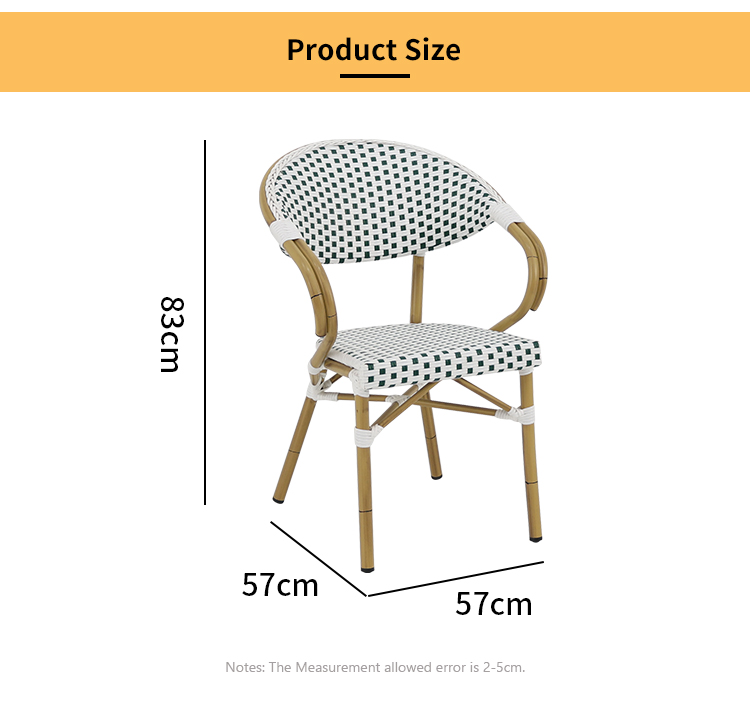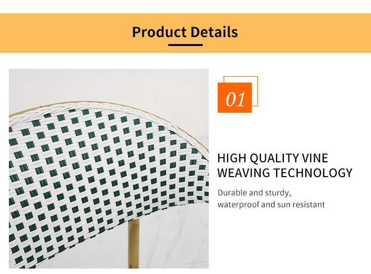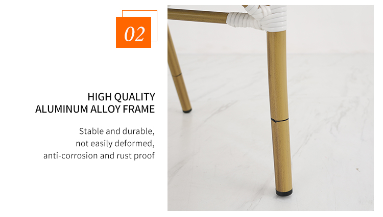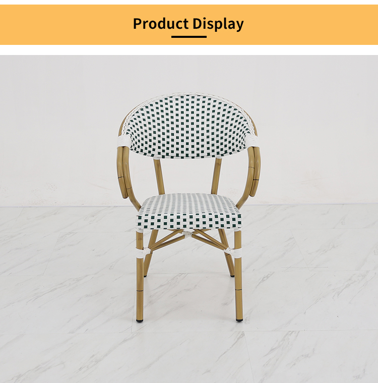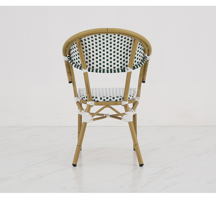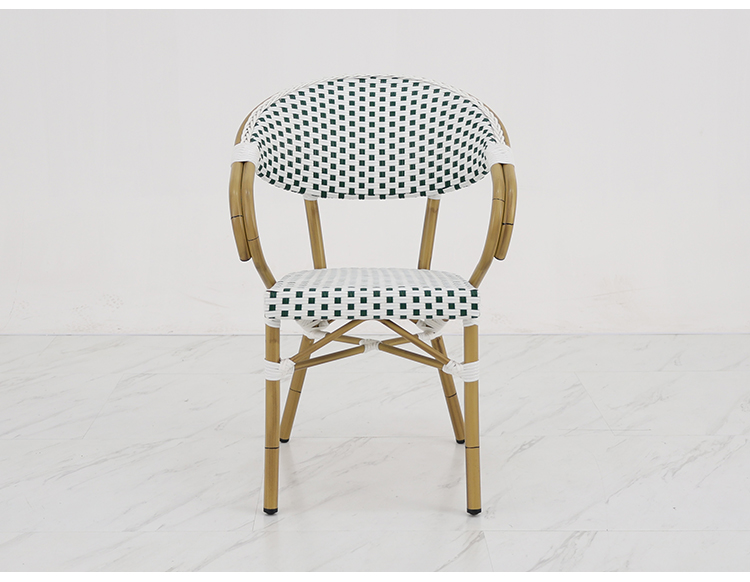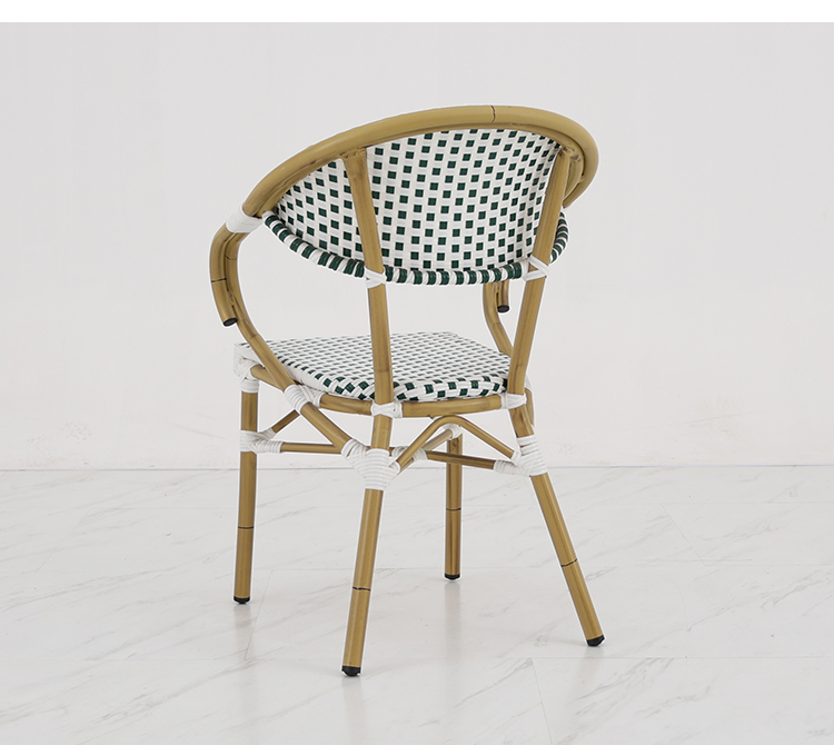 This outdoor French-style rattan chair, with its exquisite design and high-quality materials, brings a touch of French romance to your outdoor space. Its sturdy and durable aluminum alloy frame, finished with a finely brushed wood grain texture, perfectly blends modern aesthetics with natural beauty, giving the chair a unique texture and visual impact. The woven rattan backrest and cushions showcase elegant hand-woven artistry, offering not only comfort and durability but also a sense of tranquility reminiscent of a French café. Whether in an outdoor cafe or a bar terrace, this rattan chair adds a touch of sophistication and taste to your space.