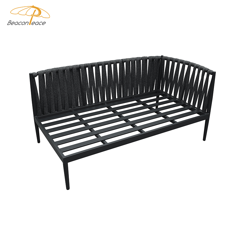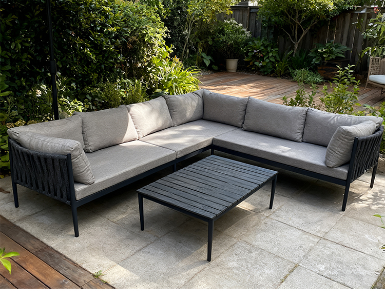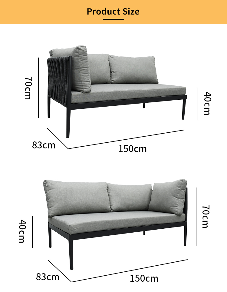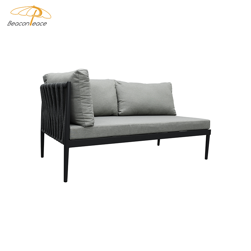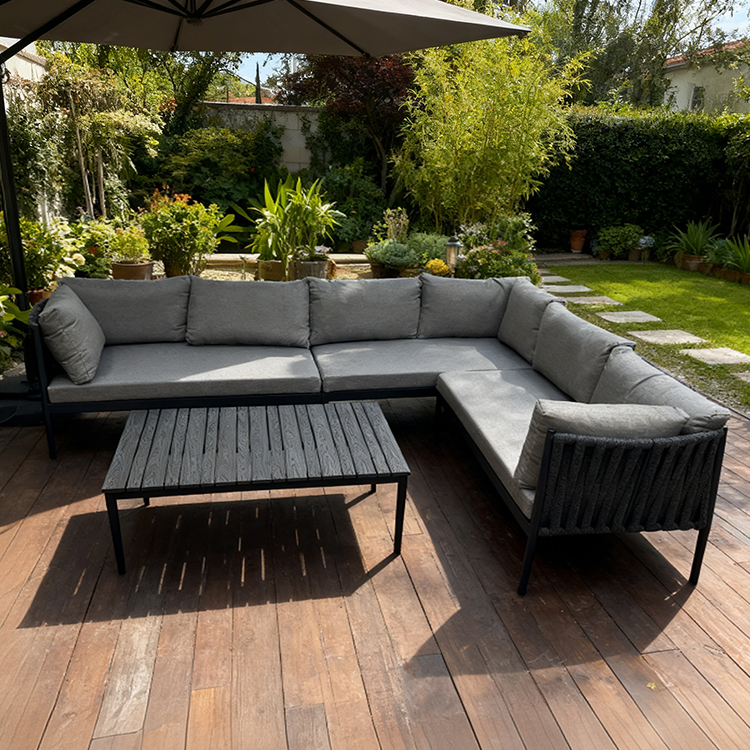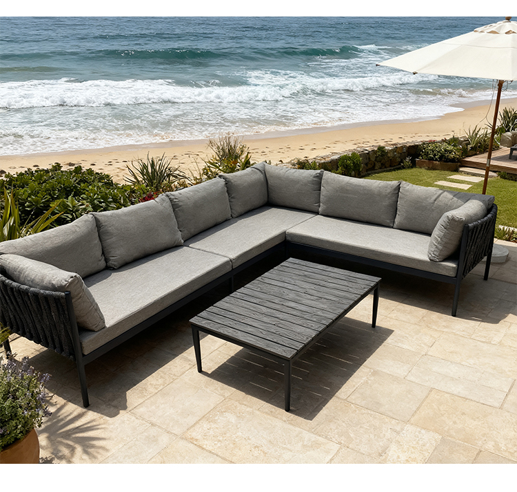 This outdoor L-shaped sofa features a sturdy and durable aluminum alloy frame, designed specifically for outdoor environments. The exterior is adorned with exquisite braided rope details, adding a touch of natural and refined beauty. Equipped with waterproof cushions, it stays comfortable and dry whether in bright sunshine or light rain. The flexible L-shaped design adapts to various outdoor space needs, perfectly creating a spacious and stylish relaxation corner. Whether sharing time with family and friends or enjoying leisurely moments in the garden or on the terrace, this sofa is an ideal choice.